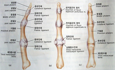 [중수지절관절과 지절간관절] (a)측면. (b)전면(장측면). (c)후면.