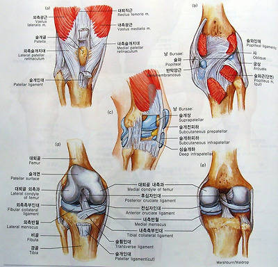 [우측슬관절] (a)전면. (b)천층후면. (c)외측면. (d)전면(슬관절 굴곡과 슬개골 제거 상태). (e)심층후면.