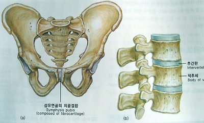 [섬유연골] (a)치골결합. (b)추체 사이의 추간관절.