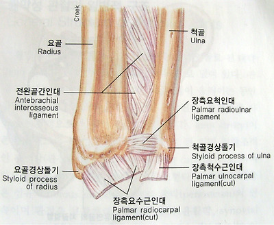 [척골과 요골의 옆과 옆 관절은 인대결합이다. 골간인대는 뼈들을 단단하게 붙여주며