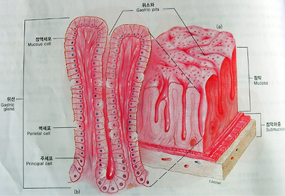 [(a)위소와는 위선이 점막에 개구되는 부위이다. (b)위선은 점액세포, 주세포, 벽세포로 구성되며,