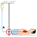 ⑥ 수액이 환자에게 들어갈 수 있도록 한다. 이때 수액 set의 위치를 우심 방 중앙 액와 선상으로 한다.