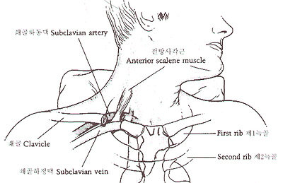 2. 국소마취제 주사 : 주사침을 쇄골 중간에서 약간 바깥에 쇄골 아래 2-3c되는 곳