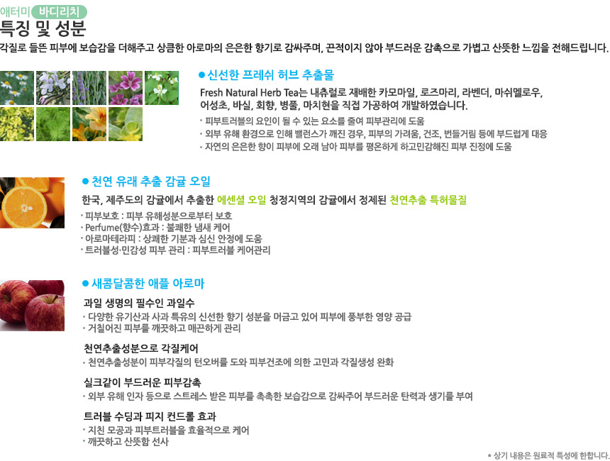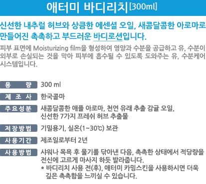 신선한 내추럴 허브와 상큼한 에센셜오일, 새콤달콤한 아로마로 만들어진 촉촉하고 부드러운 애터미 바디로션!