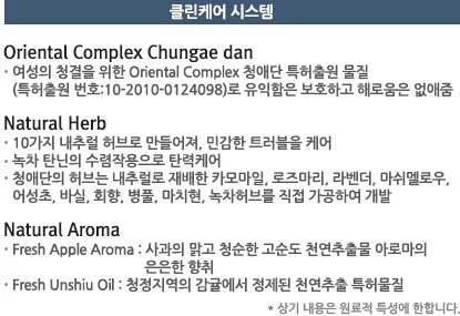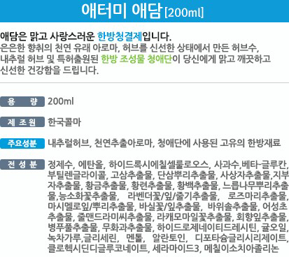 은은한 향취의 천연 유래 아로마, 허브를 신선한 상태에서 만든 허브수, 내추럴 허브 및 특허출원된 한방 조성물 청애단이 맑고 깨끗하고 신선한 건강함을 드립니다.