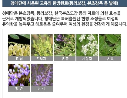 ①여성의 청결을 위한 청애단 특허출원 물질(특허출원번호 10-2010-124098) : 유익함은 보호하고 해로움은 없애줌.