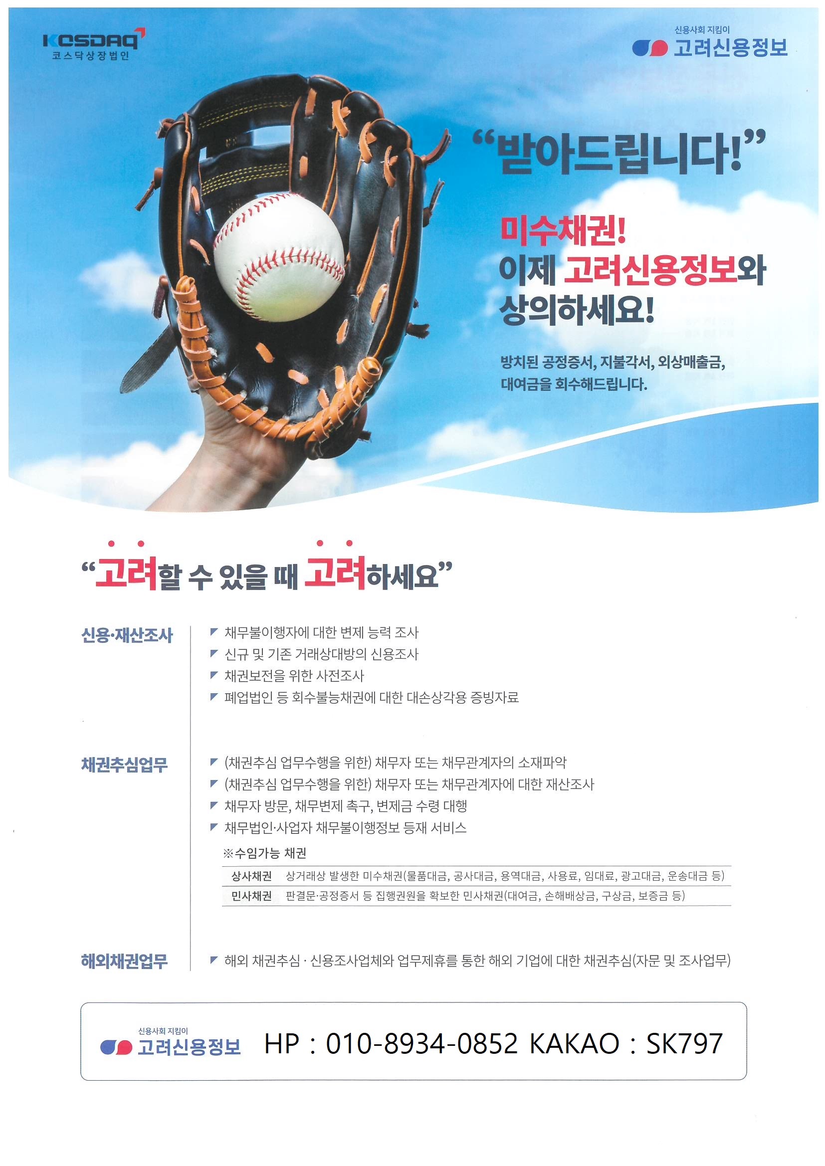 빌려준돈, 거래처미수금, 대신 받아주는곳 바로, 채권추심 업계 1위 국내최대규모, 신용정보사 유일 코스닥상장법인, 고려신용정보 상담팀 심기갑 팀장입니다.