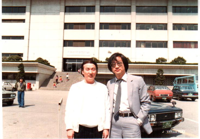 (1973년에 모이자노래하자를 처음 연출한 진필홍PD(왼쪽)와 카페지기 서봉석-본관앞에서 1983)
