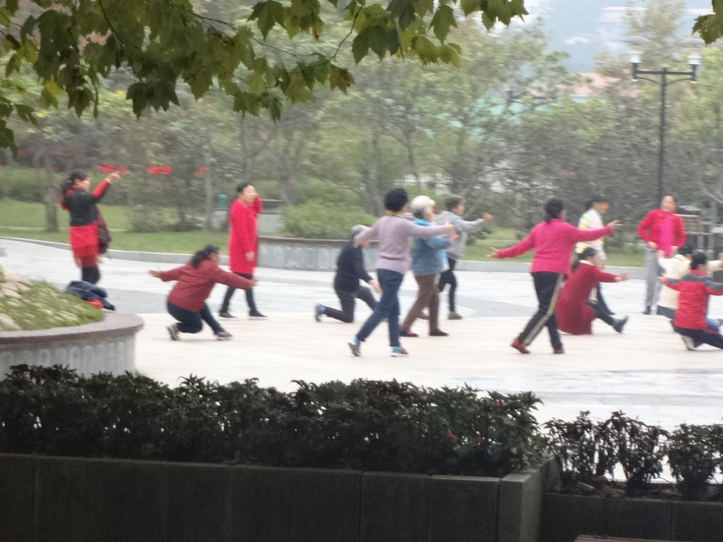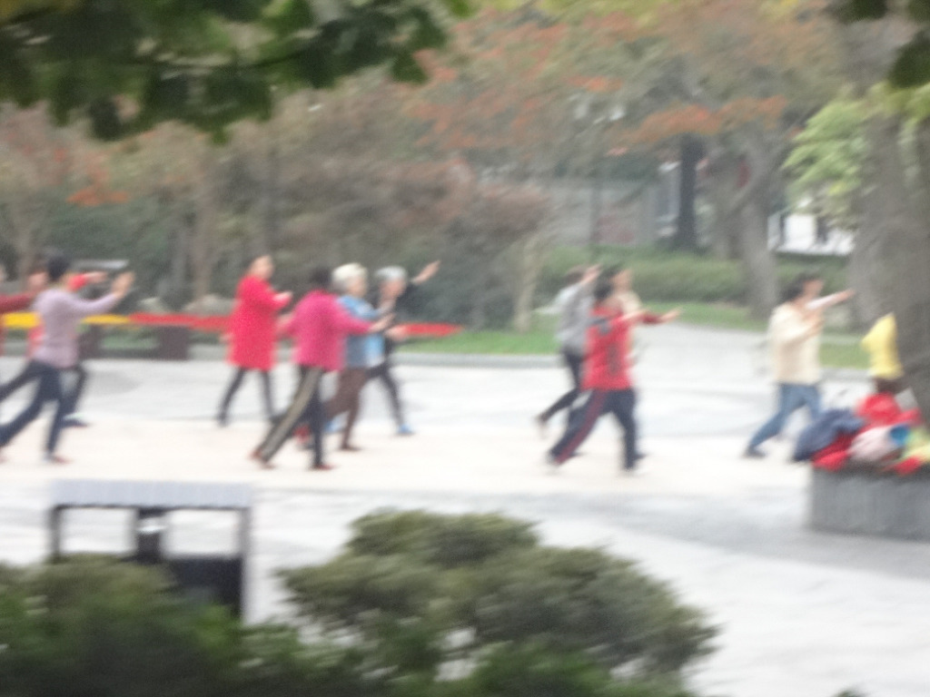 공터에는 이른 아침 중국의 공원이나 거리에서 흔히 볼수 있는 체조겸 맨손 운동 을