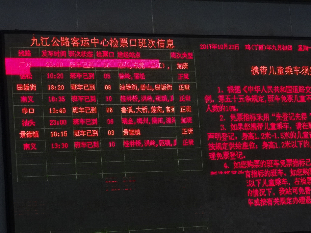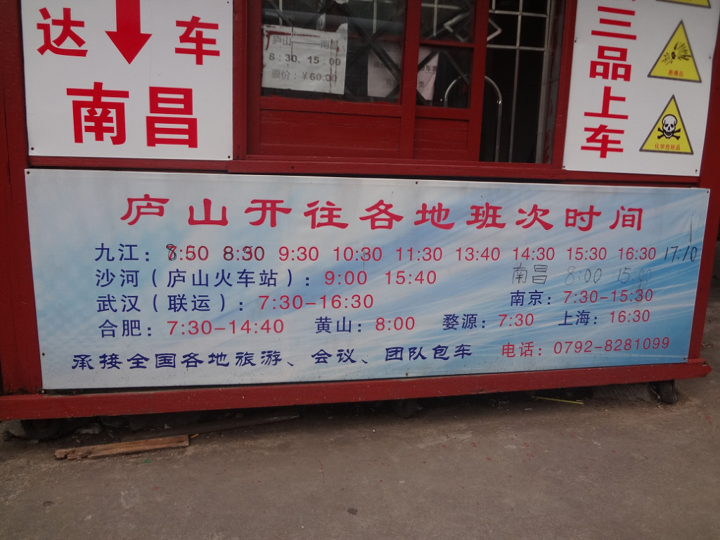 주장 九江(구강) 행 버스 巴士) 시간표 : 7시 20분, 7시 50분, 8시 30분, 9시 30분,