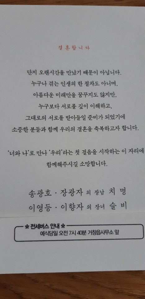 알려드립니다 거창에 거주하고 있는 거창 초등53회동기 송광호 친구의 장남 치명 군이 아래 안내와 같이 화촉을 밝혀 새출발을 하오니 각 지역에 계신 친구들 바쁘신줄 아오나 많이 오셔서 새로 탄생하는 한쌍의 부부를 듬뿍 축하해주시면 대단히 고맙겠습니다. 농협:841137 52 080824 예금주:송광호 |
