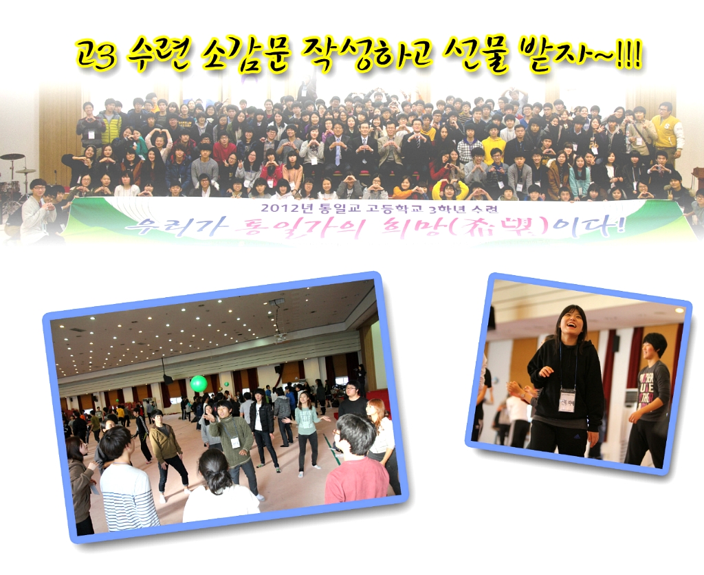 11월 16일부터 18일까지 2박 3일로 구리 일화교육관에서 진행된 2012년 통일교 고등학교 3학년 수련 참석자들을 대상으로 CARP카페(http://cafe.daum.net/kcarp)에 소감문쓰기 이벤트를 진행 합니다. 참석한 고등학교 3학년 학생들은 꼭~~! 이벤트에 참여해 보세요~!!!