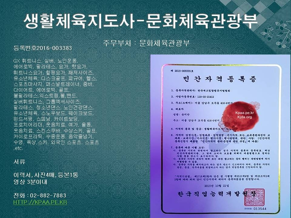 작성자한국문화체육관광협회작성시간24.11.25조회수25 목록 댓글 0무용,댄스,댄스ALL 1급 자격증, 지사, 생활체육,엔터테인먼트 무용,사교,방송댄스,KPOP,재즈,실용댄스,라인,줌바,스포츠,밸리,스트릿,비보이,줌바댄스,탭댄스,요가,필라테스,댄스스포츠,음악,문인,생활,웰빙,실용,실버,PT,GX,요가,훌라,체조,모델,어린이,뮤지컬,영어댄스,밸리,비보이,스트릿,힙합,연기,영화,악기,스포츠,모델,공연예술,대중문화etc