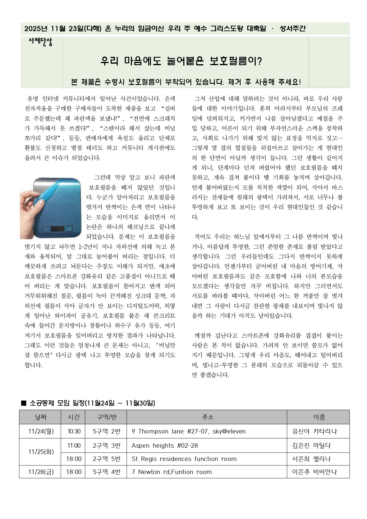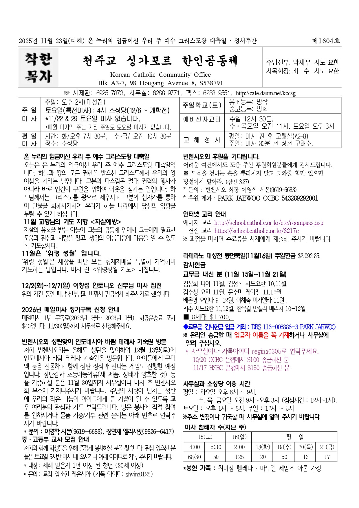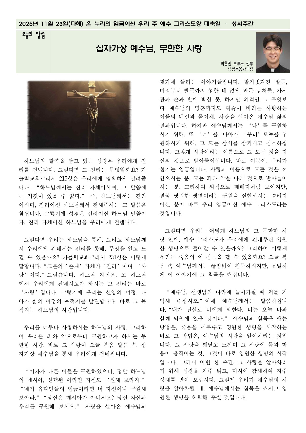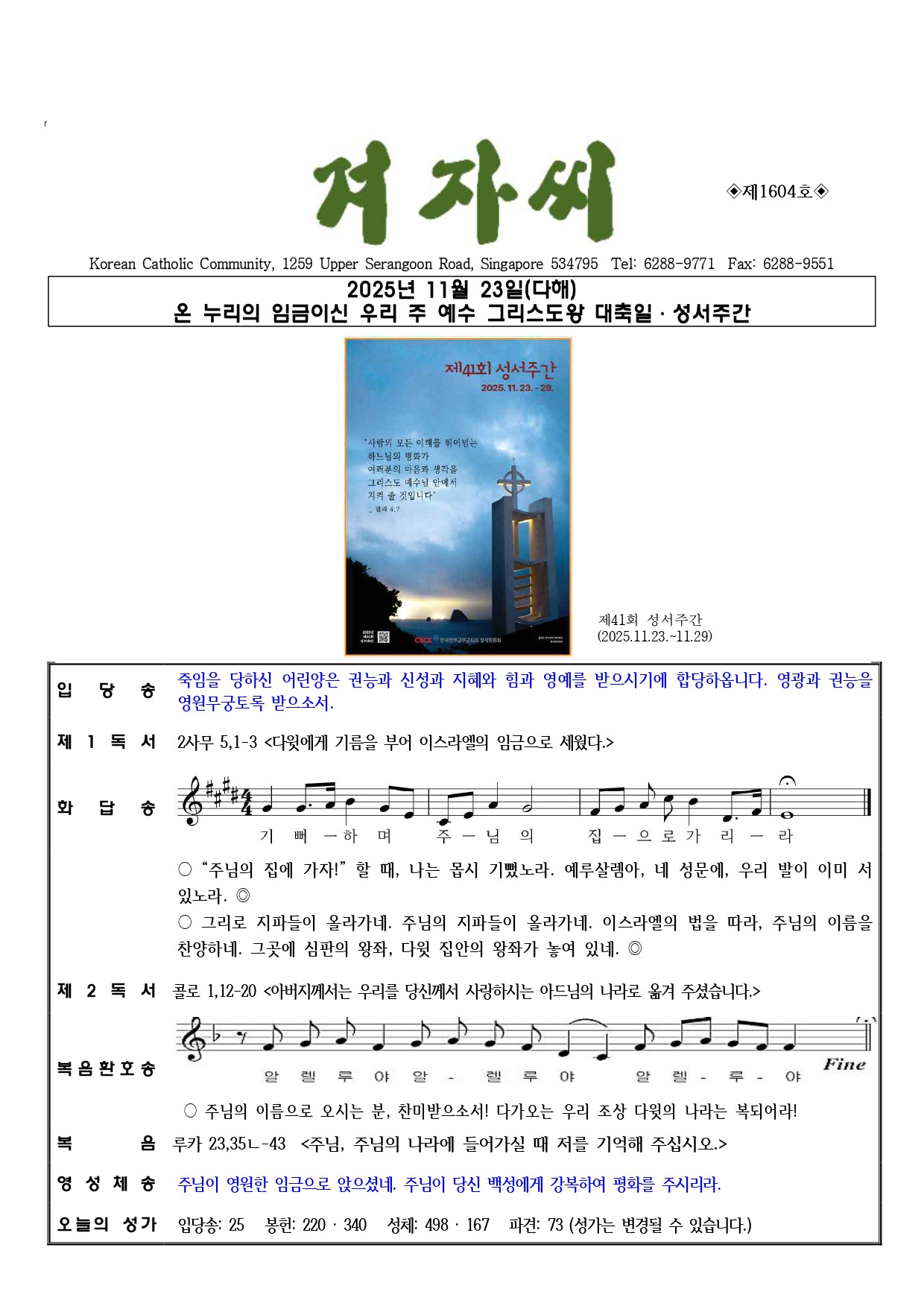 제1604호 온 누리의 임금이신 우리 주 예수 그리스도왕 대축일 · 성서주간(2025.11.23) 작성자레지나^^|작성시간25.11.24|조회수63 목록 댓글 0 글자크기 작게가 글자크기 크게가 제1604호 그리스도왕 대축일(2025.11.23).hwp1.03MB 첨부파일첨부된 파일이 5개 있습니다. jpg 파일 제1604호 온 누리의 임금이신 우리 주 예수 그리스도왕 대축일 · 성서주간_page-0002.jpg 다운로드 jpg 파일 제1604호 온 누리의 임금이신 우리 주 예수 그리스도왕 대축일 · 성서주간_page-0003.jpg 다운로드 jpg 파일 제1604호 온 누리의 임금이신 우리 주 예수 그리스도왕 대축일 · 성서주간_page-0004.jpg 다운로드 jpg 파일 제1604호 그리스도왕 대축일(2025.11.23)-2 (1)_page-0001.jpg 다운로드 hwp 파일 제1604호 그리스도왕 대축일(2025.11.23).hwp 다운로드 다음검색 현재 게시글 추가 기능 열기 북마크 공유하기 신고 센터로 신고 댓글 댓글 0 댓글쓰기 답글쓰기 댓글 리스트