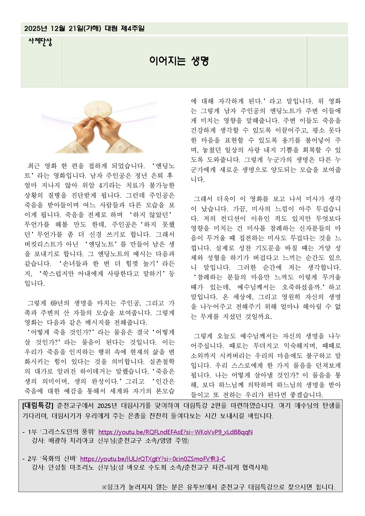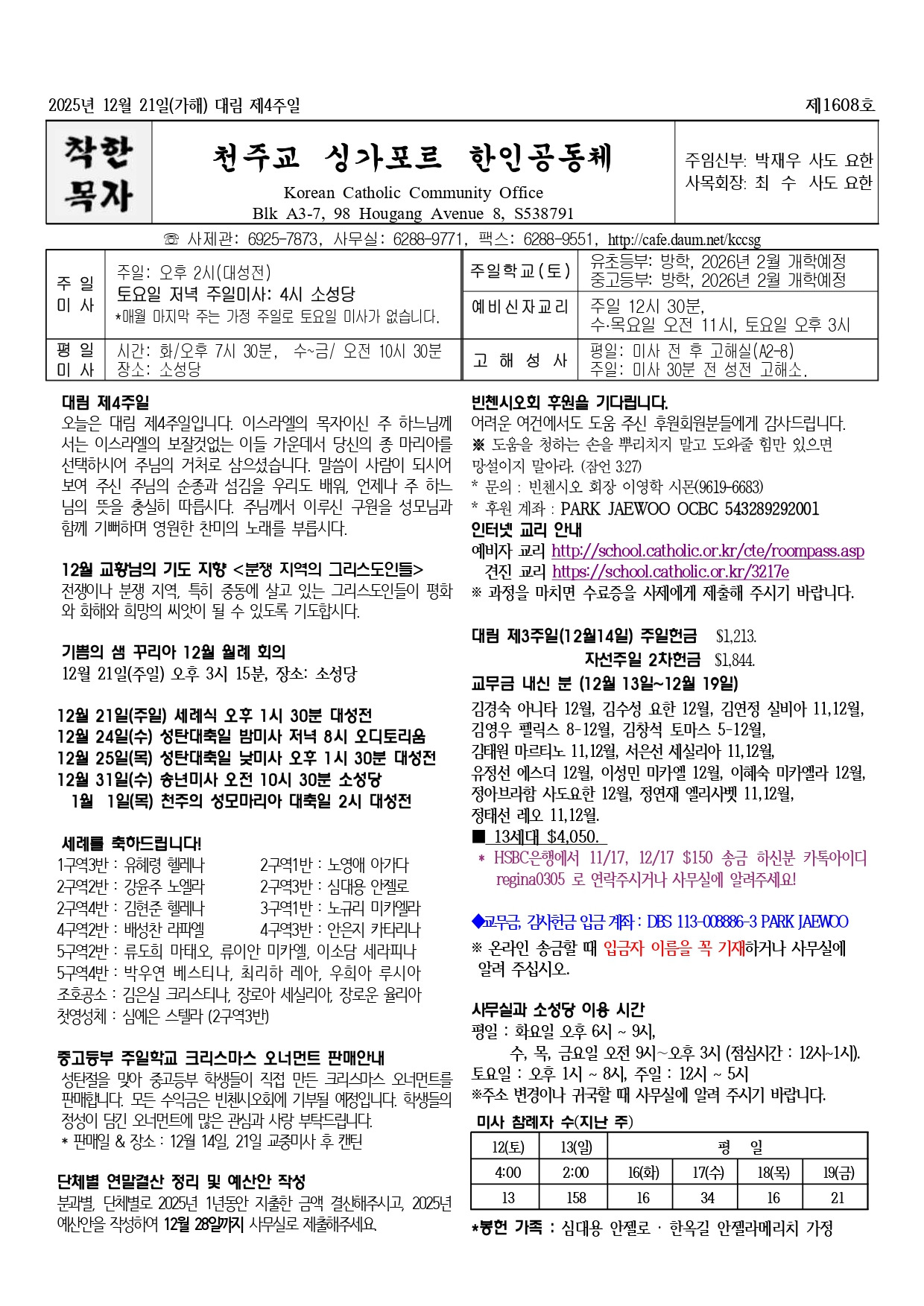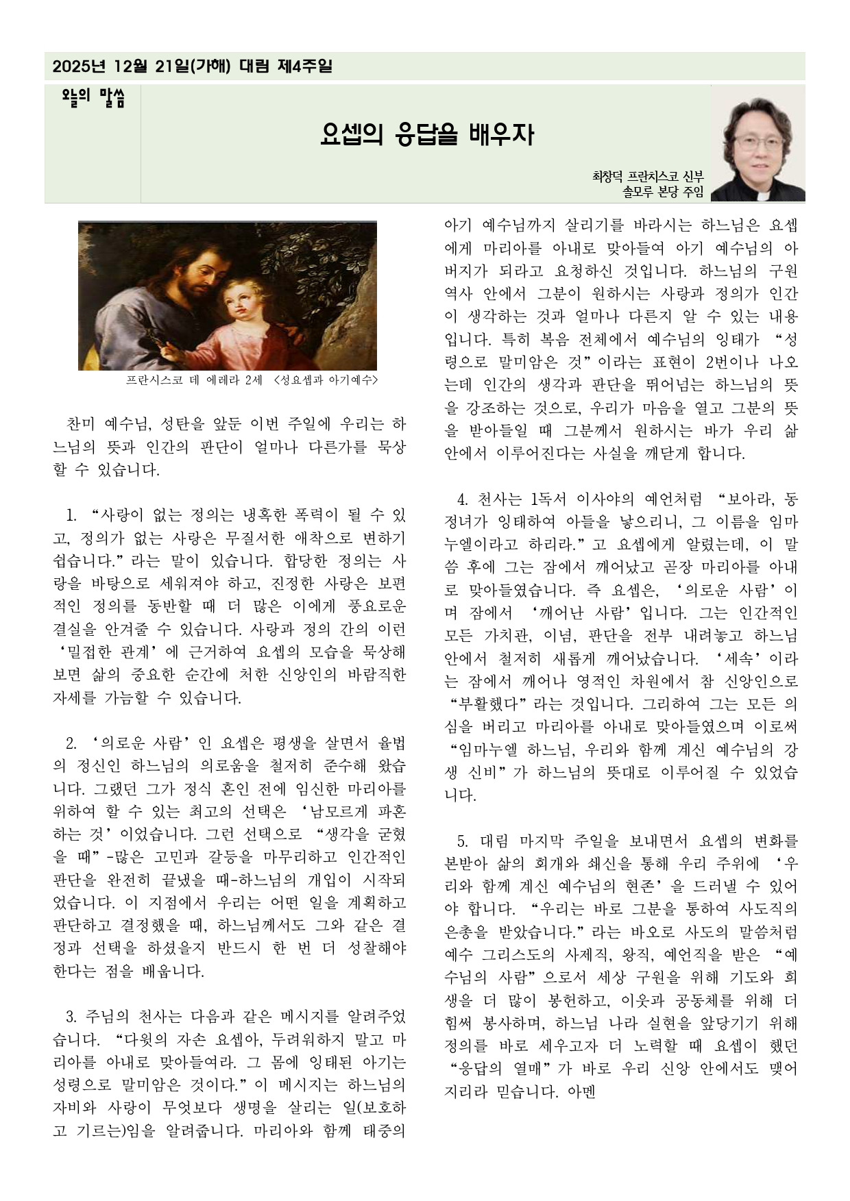 제1608호 대림 제4주일(2025.12.21) 작성자레지나^^|작성시간25.12.21|조회수60 목록 댓글 0 글자크기 작게가 글자크기 크게가 제1608호 대림제4주일(2025.12.21).pdf393.71KB 첨부파일첨부된 파일이 5개 있습니다. jpg 파일 제1608호 대림제4주일(2025.12.21)_pages-to-jpg-0002.jpg 다운로드 jpg 파일 제1608호 대림제4주일(2025.12.21)_pages-to-jpg-0003.jpg 다운로드 jpg 파일 제1608호 대림제4주일(2025.12.21)_pages-to-jpg-0004.jpg 다운로드 jpg 파일 제1608호 대림제4주일(2025.12.21)_pages-to-jpg-0001.jpg 다운로드 pdf 파일 제1608호 대림제4주일(2025.12.21).pdf 다운로드 다음검색 현재 게시글 추가 기능 열기 북마크 공유하기 신고 센터로 신고 댓글 댓글 0 댓글쓰기 답글쓰기 댓글 리스트