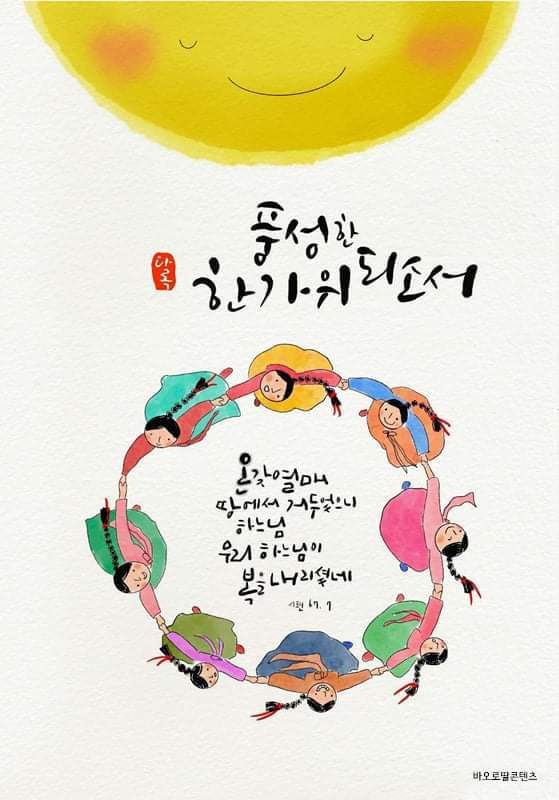 물론 코로나로 인해서 예전과 같이 명절 때의 만남이 작년에 이어 올해도 쉽지 않습니다. 그러나 이 한가위는 분명히 아래와 같은 감사의 마음을 갖도록 합니다. 우리에게 생명을 전해주신 조상님들께 감사를 드리는 것, 우리의 생명을 유지해 주기 위해 해마다 온갖 곡식과 과일을 제공해 주는 자연에 감사하는 것, 그리고 무엇보다 우리의 모든 것을 주신 주님께 감사와 찬미를 드리는 날인 것입니다.