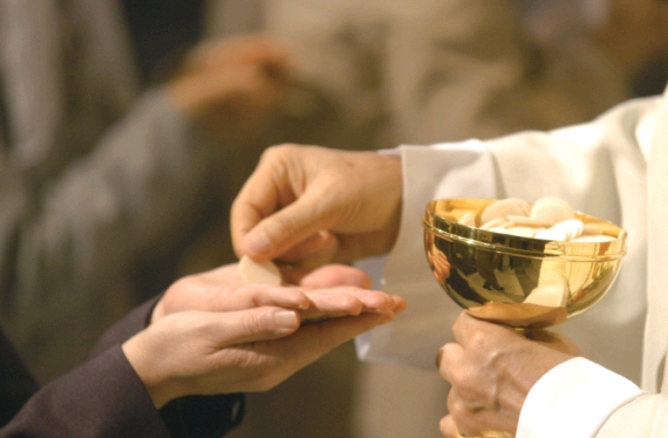 4세기 말 예루살렘의 성 치릴로 주교는 「신비의 교리 강화」란 저서에서 “성체를 영할 때는 오른손을 내밀고 그 위에 왼손을 얹는다. 마치 황제를 맞이하듯 성체를 받고, ‘그리스도의 몸’ 하고 사제가 말하면 ‘아멘’ 하고 대답한다. 그다음 손 위의 성체께 절하고 응시한 후 성체를 입으로 가져가 영한다”고 설명했어. 이처럼 가톨릭교회는 전통적으로 손으로 성체를 정성스럽게 받아 모셔 왔단다.