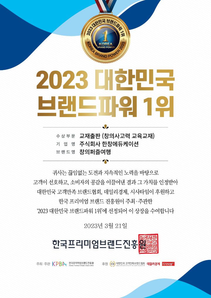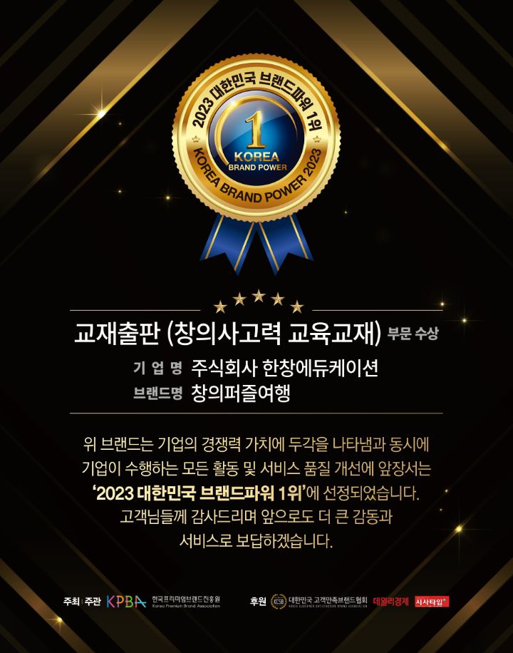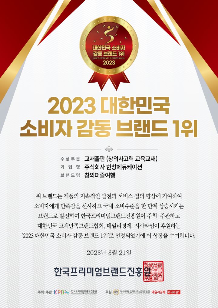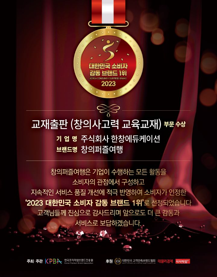 교육법인 한창에듀케이션에서 개발하여 출판한 창의사고력 교육 교재 '창의퍼즐여행'이 2023 BRAND AWARD 2관왕을 수상하게 되었다.