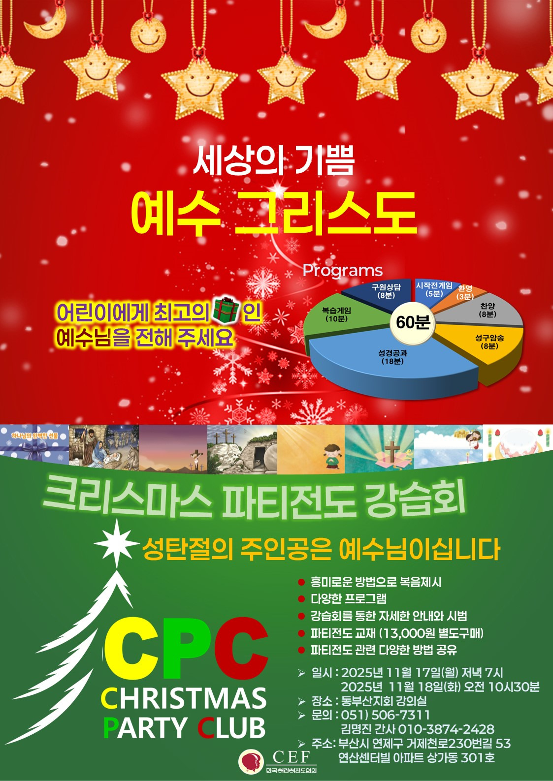 2025년 크리스마스 파티전도 작성자CEF 동부산지회|작성시간25.11.06|조회수154 목록 댓글 0 글자크기 작게가 글자크기 크게가 진행순서ppt.pptx16.09MB파티전도 전체교안.hwp1.44MB세상의 기쁨 (공과).hwp100.50KB파티복습게임 동물.hwp6.18MB세계지도.hwp753.00KB테이블 장식.pdf13.64MB왜 왜 나를 높여.mp31.23MB 첨부파일첨부된 파일이 8개 있습니다. pptx 파일 진행순서ppt.pptx 다운로드 hwp 파일 파티전도 전체교안.hwp 다운로드 hwp 파일 세상의 기쁨 (공과).hwp 다운로드 hwp 파일 파티복습게임 동물.hwp 다운로드 hwp 파일 세계지도.hwp 다운로드 pdf 파일 테이블 장식.pdf 다운로드 jpg 파일 2025년 크리스마스 파티 강습회 포스터.jpg 다운로드 mp3 파일 왜 왜 나를 높여.mp3 다운로드 다음검색 현재 게시글 추가 기능 열기 북마크 공유하기 신고 센터로 신고 댓글 댓글 0 댓글쓰기 답글쓰기 댓글 리스트