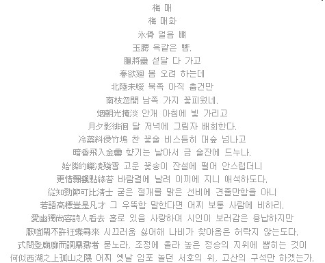 마치 시가 아니라 그림을 그린 듯한 위의 시는 조선 중기 권필(1569-1612)이 지은 「매화(梅花)」란 작품이다. 보탑시(寶塔時) 형태를 취한 이 시에서는 ‘굳은 절개를 맑은 선비에 견줄만하다(從知勁節可比淸士)’고 말하며 매화의 굳은 절개에 대해 찬미하고 있다.