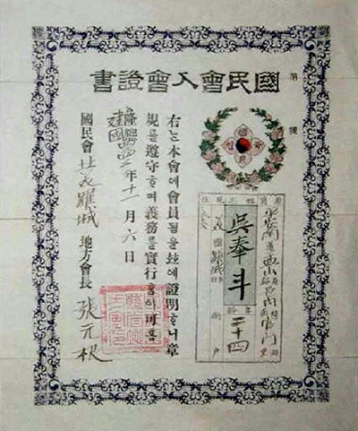 1910년 11월에 미국에서 발행한 국민회 입회 증서에서도 태극을 중심으로 무궁화 꽃가지를 두른 모습이 잘 표현되어 있다.