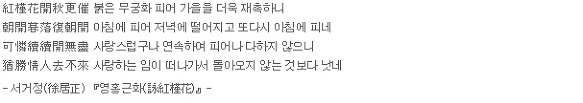 조선 서거정의 『붉은 무궁화』라는 시이다. 계속하여 피고 지기를 반복하는 무궁무진한 무궁화가 떠나가서 돌아오지 않는 임보다 나음을 말하고 있다.