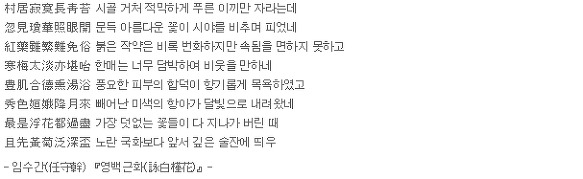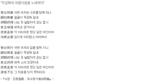 조선 임수간(1665-1721)은 이 시에서 흰 무궁화를 작약이나 매화보다 낫다고 칭송하며 무궁화의 아름다움을 이야기했다.