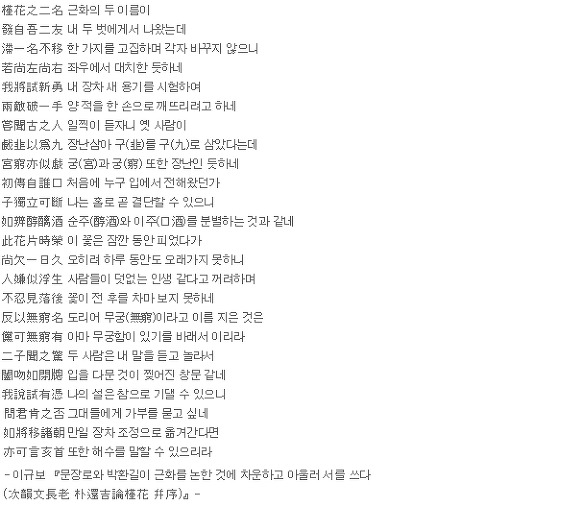 또 한 사람은 ‘무궁(無宮)’이라고 말하며, 무궁의 의미는 옛날 군왕이 이 곷을 사랑하였는데, 육궁(六宮)의 궁녀들이 무색(無色)하여서 그랬다는 것이었다. 각자 고집하여 결론을 내리지 못하였다. 그로 인하여 백낙천(白樂天)의 시를 찾아서, 그 운(韻)을 취하여 각자 한 편씩을 짓고서 또한 나에게도 회답하도록 권하였다.
