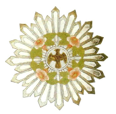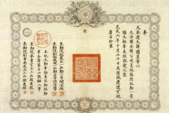 훈장 증서의 태극, 오얏꽃, 무궁화 문양. 1902