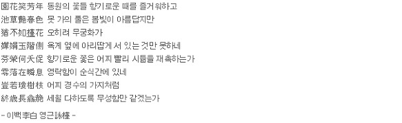‘근(槿)’은 무궁화를 지칭하는 것으로 이백은 무궁화가 동원의 어떤 꽃보다도 아름답지만 빨리 시듦이 안타깝다고 노래했다.