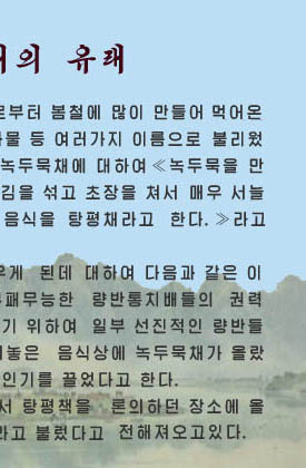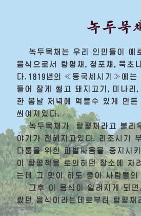 녹두묵은 불군 녹두를 보드랍게 갈아 얻어낸 앙금을 끓여서 식혀 굳힌것인데 묵가운데서 제일 인기있는 음식이다.