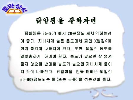 닭알을 너무 높은 온도에서 찌면 구멍이 숭숭 생기고 볼품이 없어지므로 낮은 불에서 찌는 것이 좋다.