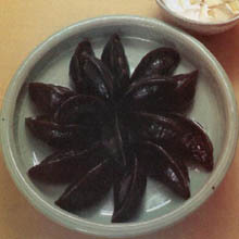 - 반죽물을 30g 정도씩 떼내여 소를 넣고 반달 모양으로 빚어 시루에서 찐다.