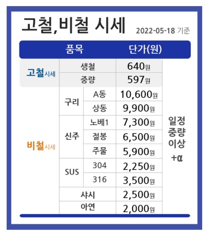 고철, 비철 금속, 알루미늄 가격 시세(220702), 고물상, 고철, 비철, 폐품처리장, 재활용 자원, 작성자채중사 선임하사♥^^|작성시간22.07.02|조회수8,624 목록 댓글 1 글자크기 작게가 글자크기 크게가 고철, 비철 금속, 알루미늄 가격 시세(220702),고물상, 고철, 비철, 폐품처리장, 재활용 자원, 다음검색 현재 게시글 추가 기능 열기 북마크 신고 센터로 신고 댓글 댓글 1 댓글쓰기 답글쓰기 댓글 리스트 작성자채중사 선임하사♥^^ 작성자 본인 여부 작성자 | 작성시간 22.07.05 고철, 비철 금속, 알루미늄 가격 시세(220702),고물상, 고철, 비철, 폐품처리장, 재활용 자원, 댓글 전체보기