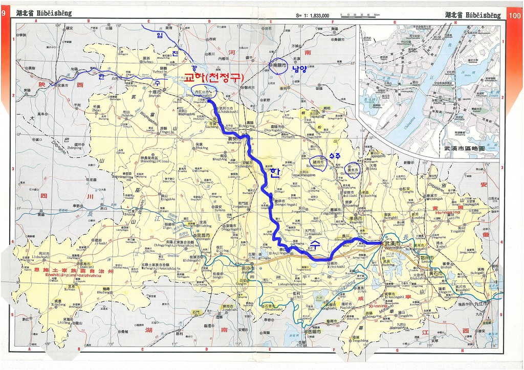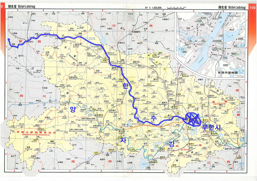 위 지도를 보면 한수가 흘러 대륙의 중심을 적시고 드디어 양자강과 합쳐 지는 곳에 무한이 있고 그 무한 시가지에 한수 쪽의 큰 도로의 이름이 한양대로이고 양자강 쪽 건너편에 무창첨(역)이 있음을 볼 수 있다.