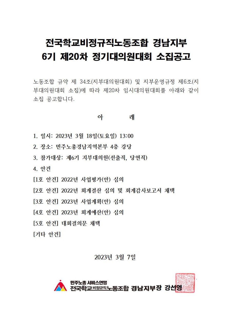 경남지부 6기 제20차 정기대의원대회 소집공고 작성자경남지부|작성시간23.03.07|조회수155 목록 댓글 0 글자크기 작게가 글자크기 크게가 다음검색 현재 게시글 추가 기능 열기 북마크 신고 센터로 신고 댓글 댓글 0 댓글쓰기 답글쓰기 댓글 리스트
