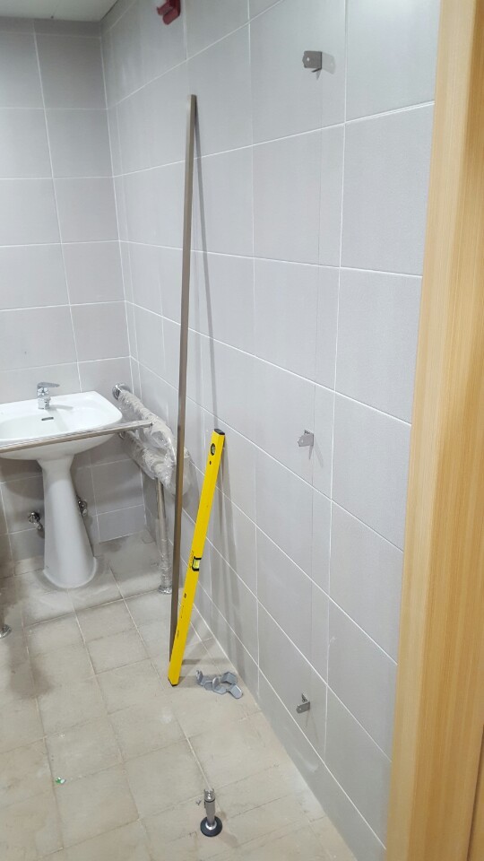 고정판을 키우면 개구부의 확보에 어려움이 있기에 일반 슬라이드 화장실칸막이로는 수치상 불가능 하기에 이번 현장처럼 더블슬라이드로 진행을 할 수 밖에 없습니다.