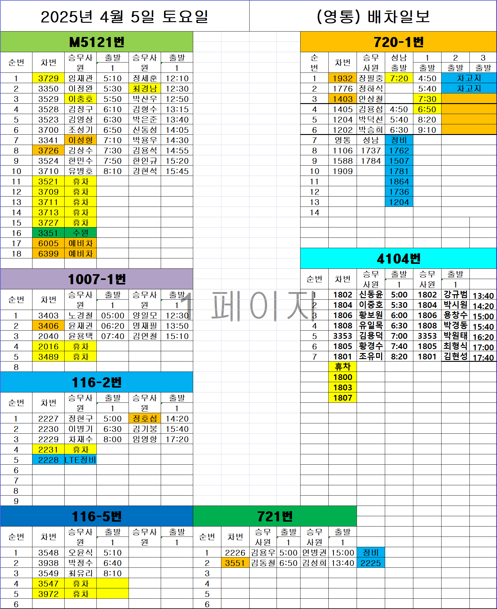 영통 04월05일 토요일 배차일보: 전방주시, 신호준수, 운행중 휴대폰 사용삼가 작성자최병윤|작성시간25.04.04|조회수192 목록 댓글 0 글자크기 작게가 글자크기 크게가 영통(다음배차04월.xlsx101.10KB 첨부파일첨부된 파일이 2개 있습니다. png 파일 20250405영통배차.png 다운로드 xlsx 파일 영통(다음배차04월.xlsx 다운로드 다음검색 현재 게시글 추가 기능 열기 북마크 공유하기 신고 센터로 신고 댓글 댓글 0 댓글쓰기 답글쓰기 댓글 리스트