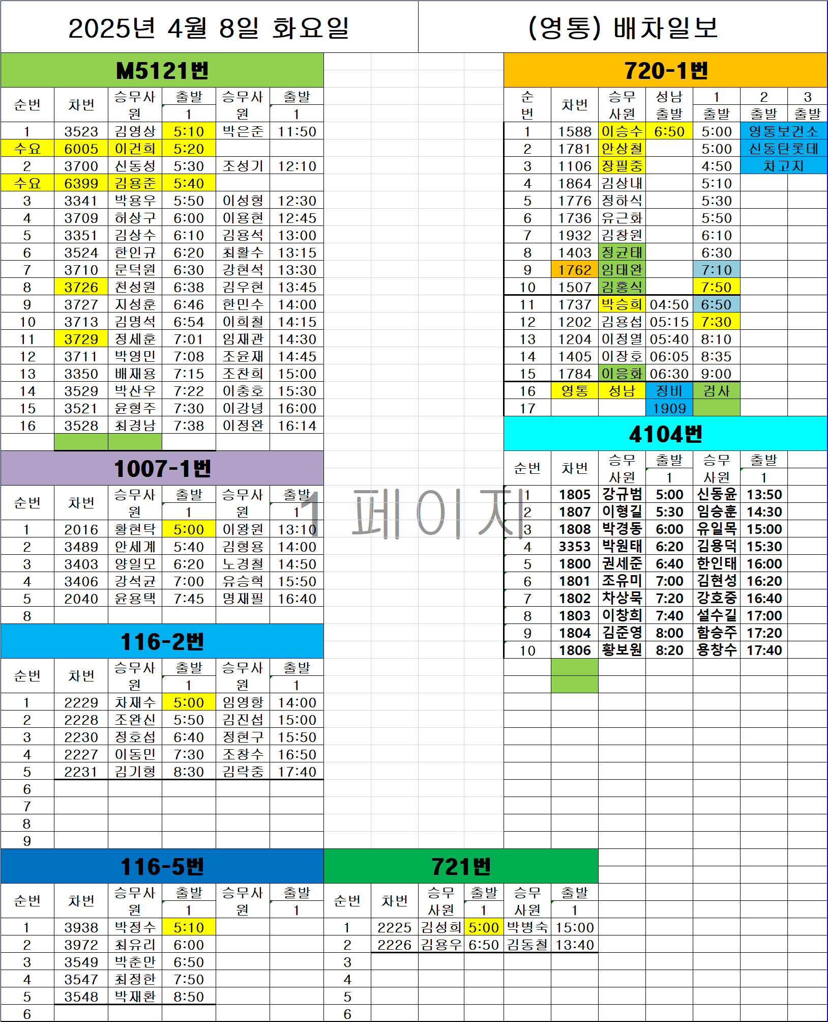 영통 04월08일 화요일 배차일보: 전방주시, 보행자 주의, 우회전시 일시정지후 진입 작성자최병윤|작성시간25.04.07|조회수235 목록 댓글 0 글자크기 작게가 글자크기 크게가 영통(다음배차04월.xlsx110.51KB 첨부파일첨부된 파일이 2개 있습니다. png 파일 20250408영통배차.png 다운로드 xlsx 파일 영통(다음배차04월.xlsx 다운로드 다음검색 현재 게시글 추가 기능 열기 북마크 공유하기 신고 센터로 신고 댓글 댓글 0 댓글쓰기 답글쓰기 댓글 리스트