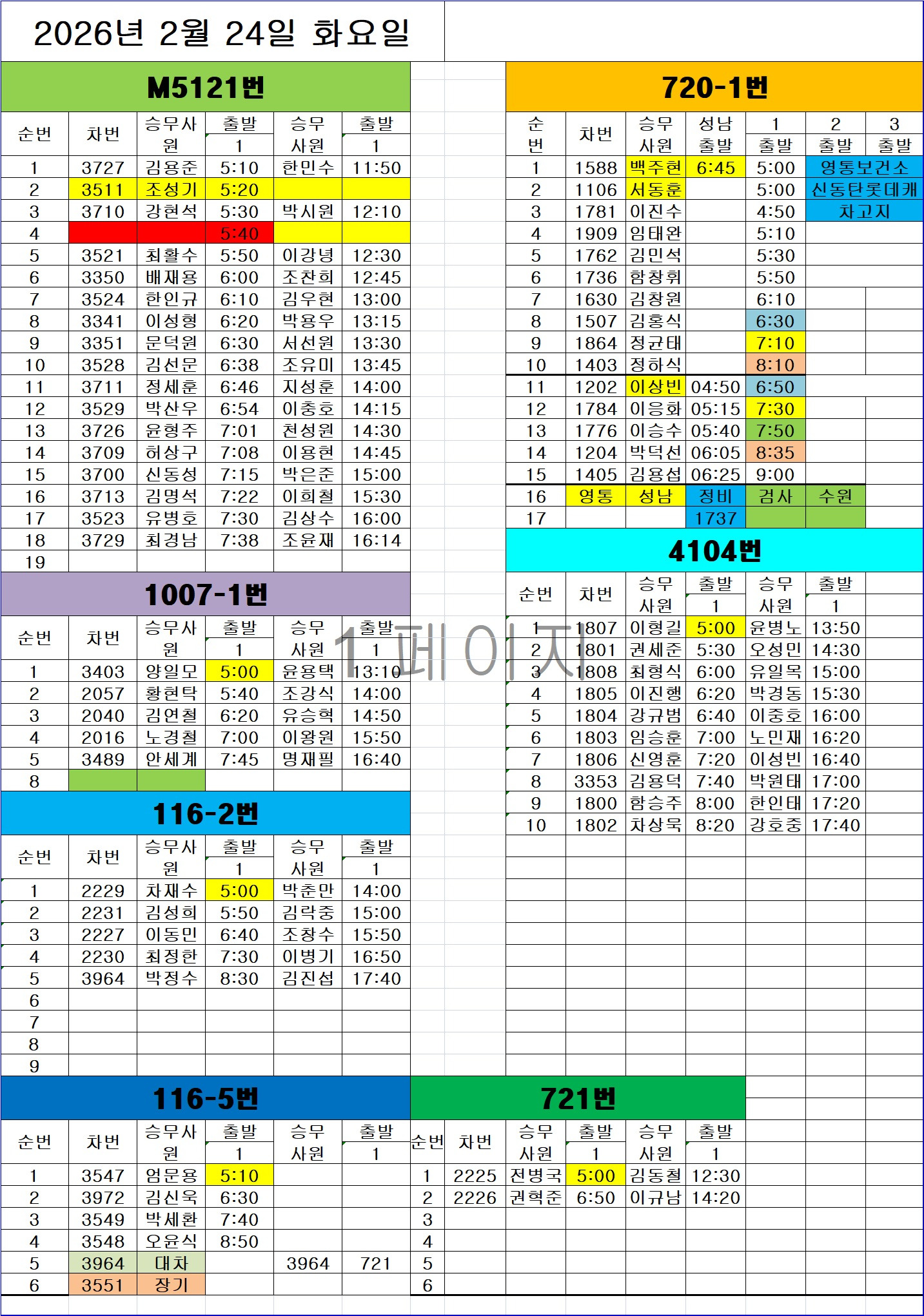 영통 02월 24일 화요일 배차일보 : 전방주시, 보행자주의, 졸음운전주의 작성자영통배차실|작성시간26.02.23|조회수193 목록 댓글 0 글자크기 작게가 글자크기 크게가 영통 02월 확인.xlsx38.56KB 첨부파일첨부된 파일이 2개 있습니다. jpg 파일 0224.jpg 다운로드 xlsx 파일 영통 02월 확인.xlsx 다운로드 다음검색 현재 게시글 추가 기능 열기 북마크 공유하기 신고 센터로 신고 댓글 댓글 0 댓글쓰기 답글쓰기 댓글 리스트