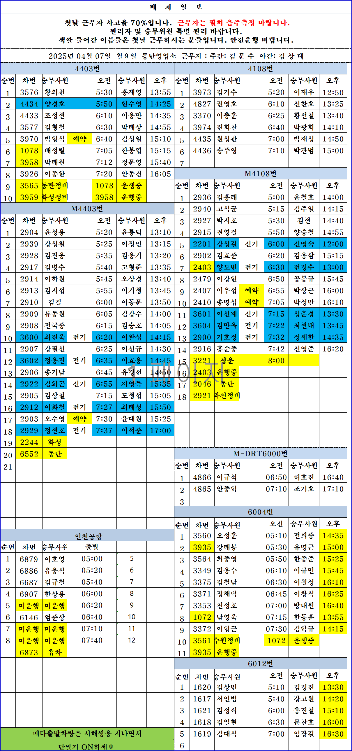 동탄영업소 04월07일 월요일 배차일보 작성자송택현|작성시간25.04.06|조회수355 목록 댓글 0 글자크기 작게가 글자크기 크게가 다음_동탄_배차일보1234.xlsx125.46KB 첨부파일첨부된 파일이 2개 있습니다. png 파일 0407배차표.png 다운로드 xlsx 파일 다음_동탄_배차일보1234.xlsx 다운로드 다음검색 현재 게시글 추가 기능 열기 북마크 공유하기 신고 센터로 신고 댓글 댓글 0 댓글쓰기 답글쓰기 댓글 리스트