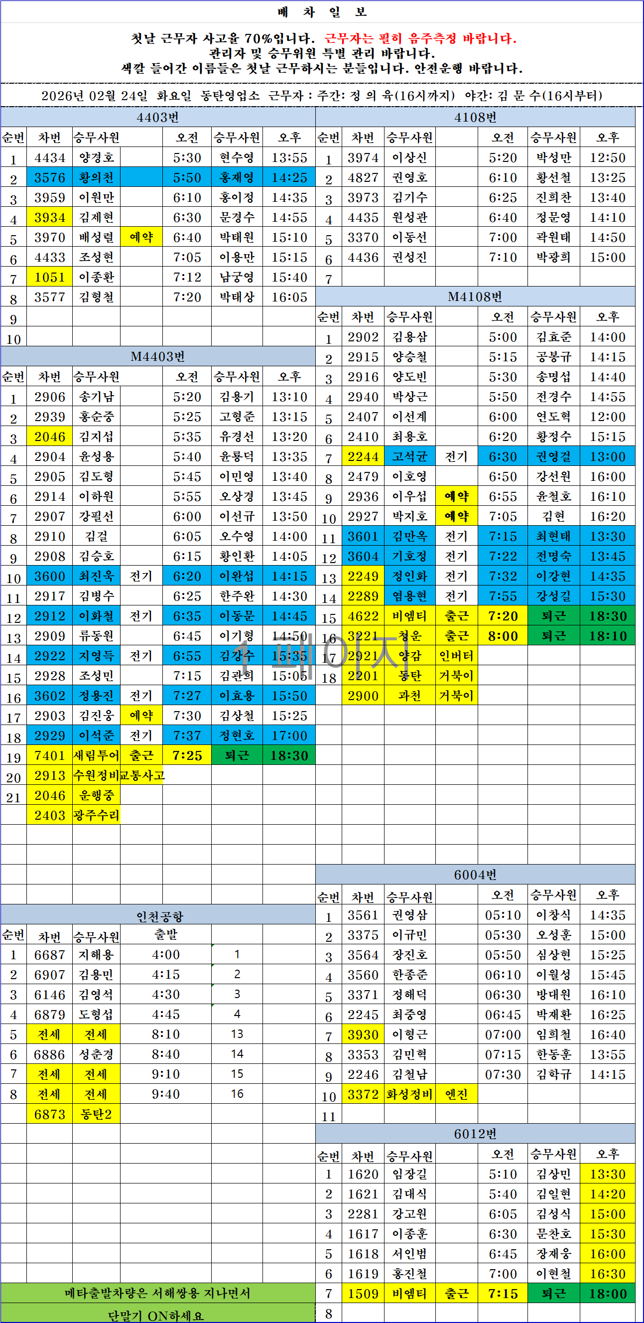 동탄영업소 02월24일 화요일 배차일보 작성자송택현|작성시간26.02.23|조회수271 목록 댓글 0 글자크기 작게가 글자크기 크게가 다음_동탄_배차일보1234.xlsx142.06KB 첨부파일첨부된 파일이 2개 있습니다. png 파일 0224.png 다운로드 xlsx 파일 다음_동탄_배차일보1234.xlsx 다운로드 다음검색 현재 게시글 추가 기능 열기 북마크 공유하기 신고 센터로 신고 댓글 댓글 0 댓글쓰기 답글쓰기 댓글 리스트