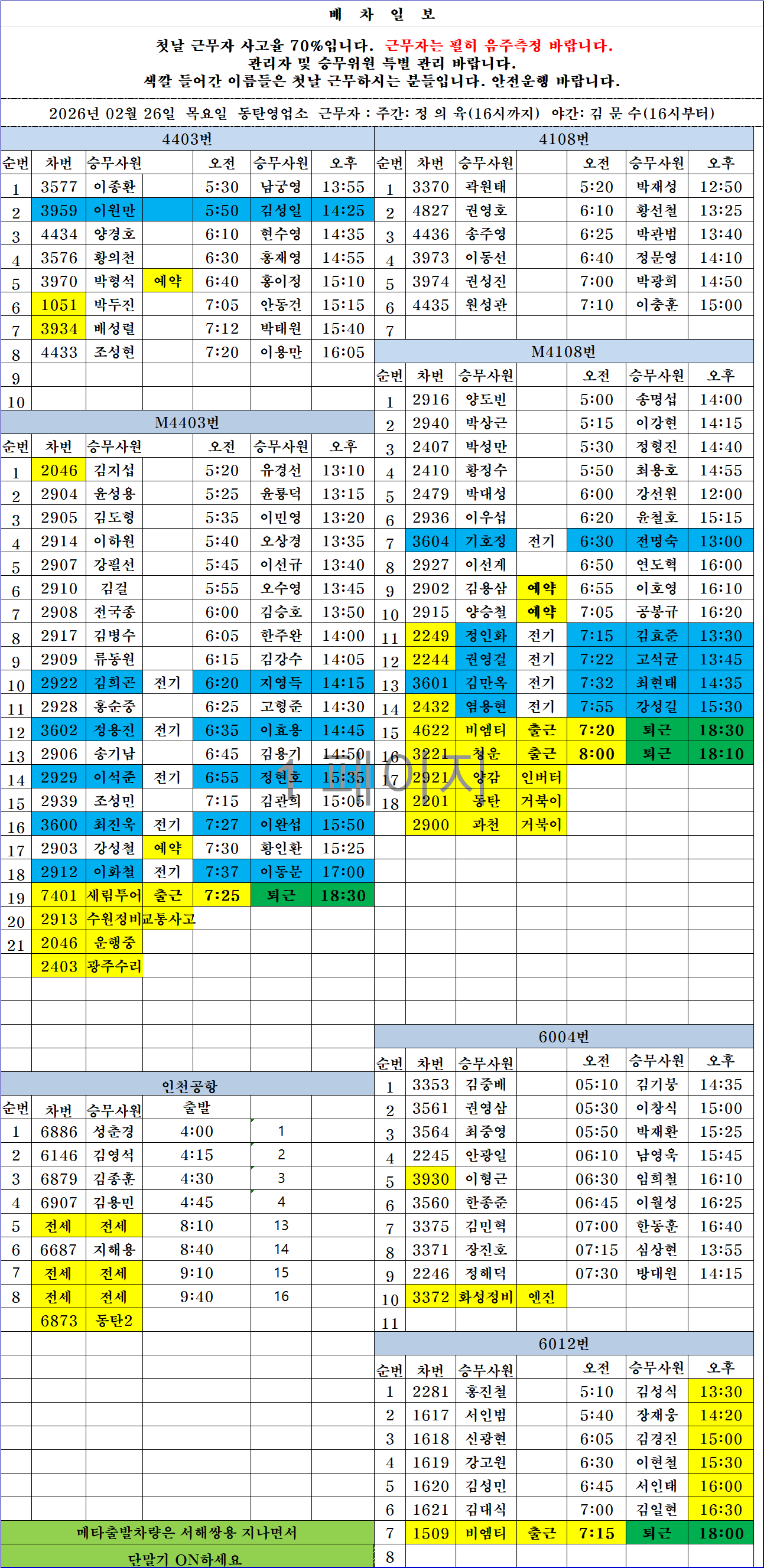 동탄영업소 02월26일 목요일 배차일보 작성자송택현|작성시간26.02.25|조회수277 목록 댓글 0 글자크기 작게가 글자크기 크게가 다음_동탄_배차일보1234.xlsx142.11KB 첨부파일첨부된 파일이 2개 있습니다. png 파일 0226.png 다운로드 xlsx 파일 다음_동탄_배차일보1234.xlsx 다운로드 다음검색 현재 게시글 추가 기능 열기 북마크 공유하기 신고 센터로 신고 댓글 댓글 0 댓글쓰기 답글쓰기 댓글 리스트