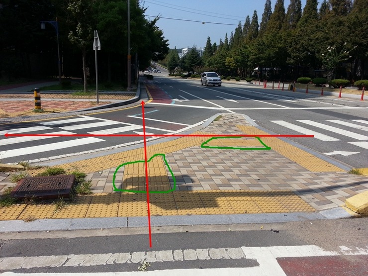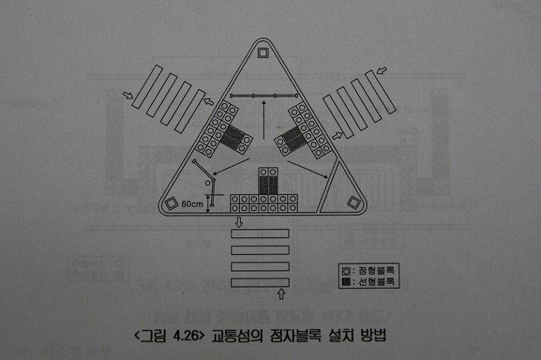 운동장사거리에서 반송사거리로 가는 충혼로에서 반송 노블파크아파트로 진출입하는 곳, 노블파크아파트 117동 앞 진입로 측 교통섬의 점자블록은 선형블록을 설치하면서 모든 것이 엉터리가 된 사례이다. 따라서 선형블록을 철거해야 올바른 설치방법이 된다.