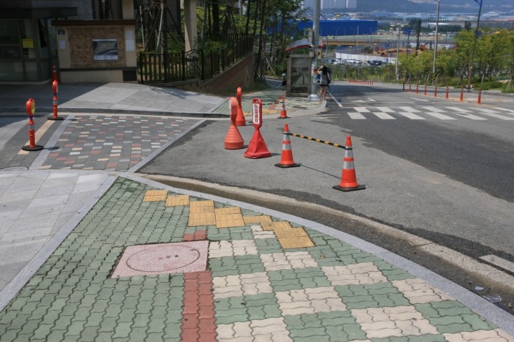 창원시 성산구 창원대로1209번길 도로에서 프리빌리지2차 아파트로 진입하는 곳에는 차량의 진입을 막기 위해 도로위에 라바콘을 설치하여 보도를 이용하는 보행자의 안전을 위협하고 있다.