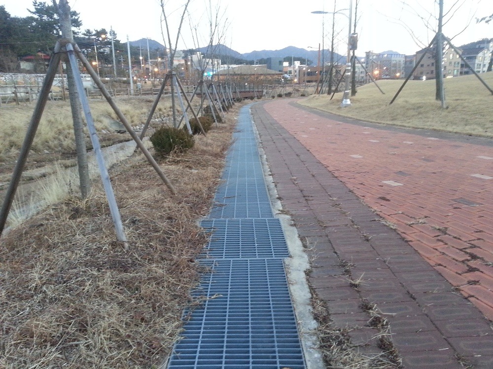 설치이유는 스틸그레이팅 주위로 보행자가 통행 시 안전확보 및 부유물 유입을 방지코자 설치하였습니다.