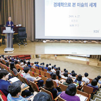KDI는 지난 6월 27일과 7월 4일 ‘경제학으로 본 미술의 세계’를 주제로 최정표 KDI 원장의 인문학 특강을 실시했다. 이번 특강은 지난 4월 경제·인문사회연구회에서 진행된 최정표 원장의 강연을 원내 직원들과 공유하기 위해 마련됐다. 최정표 원장은 총 두 개 세션(그림시장, 미술관)으로 나누어 인문학 특강을 진행했다. 1부 그림시장에서는 그림을 구매하는 이유, 그림 가격의 주요 결정요인, 세계 그림 가격의 흐름 등을 다뤘고 2부에서는 미술관의 기능 및 특성, 세계 주요 미술관 등을 소개했다. 2회에 걸쳐 진행된 이번 특강에는 200여 명의 직원들이 참석했으며 특강 이후에는 추첨을 통해 직원들에게 도서를 증정하는 시간을 가졌다.