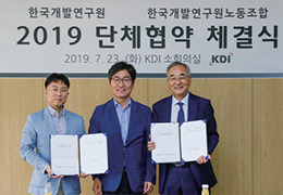 지난 7월 23일 KDI와 한국개발연구원노동조합은 ‘2019 단체협약 체결식’을 개최했다. 이번 단체협약은 5차례의 본교섭과 18차례의 실무교섭(비공식 실무교섭 제외)을 진행한 결과로, 1년 반 만에 합의에 이른 것이다. 체결식에는 최정표 KDI 원장과 서승호 한국개발연구원노동조합 위원장, 박해철 한국노총 전국공공산업노동조합연맹 위원장을 비롯해 15여 명의 노사위원들이 참석했다. 한편 단체협약서는 총칙, 조합활동, 근로조건, 노동쟁의 등을 포함해 총 84개 조항으로 구성됐다.