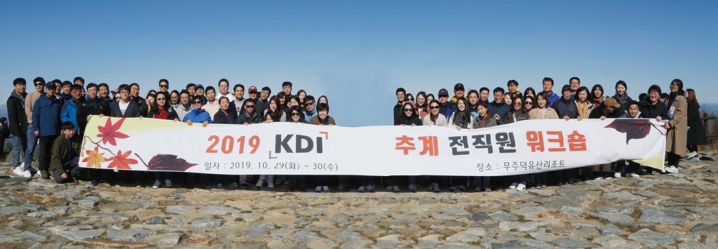 지난 10월 29일, 30일 KDIans는 단풍 가득한 무주 덕유산으로 전직원 워크숍을 떠났다. 선선한 바람마저 달콤하게 느껴지는 ‘어느 멋진 가을날’ 직원들의 표정에는 즐거움과 설렘이 가득했다. 2시간여를 달려 덕유산 리조트에 도착한 후, 워크숍 첫 순서로 원장님의 개회사가 있었다. 모처럼 전직원이 어렵사리 모인만큼 자연과 하나되며 힐링하는 시간을 갖자고 전하시고, 더불어 이번 워크숍 토의주제로 향후 KDI의 미래 비전을 제안한다며 전직원 모두가 50주년에 관심을 가져달라는 말씀을 덧붙이셨다.