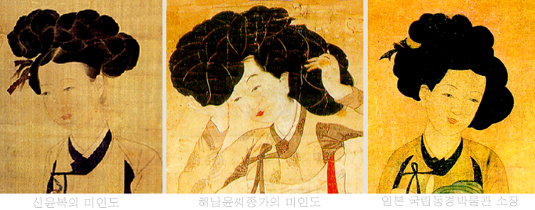 해맑은 얼굴에 비하여 당시 풍습이던 검은 다리(변체)머리는 유난히 대조적으로 아름답게 서로 상응하고 있는 것이다. 마치 얼굴을 뚜렷하고 아름답게 부각시키도록 검은 머리를 가지고 전체 배경으로 잘 이용하고 있다고나 할까?  또한 그 당시는 여인에 따라 각자 개성적으로 머리모양을 달리 틀어 올렸으니 머리를 다듬는 모양새부터 이는 독창적인 예술행위임에 틀립없는 것이었다. 덧붙여 귀밑에 하늘거리는 머리털은 지금도 유행되는 애교머리가 아니겠는가. 비교적 가늘고 긴 흰목과 저고리를 몸에 붙게 하여 특히 팔소매를 좁혀서 나타난 좁은 어깨 역시 조선시대 전형적인 미인의 모습이었다.